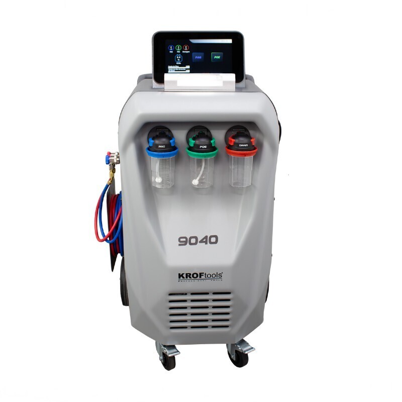 Αυτόματος σταθμός πλήρωσης κλιματισμού (φρέον) αυτοκινήτου R134a, με 2 εφεδρικούς ηλεκτρικούς ανεμιστήρες και ψηφιακή απεικόνιση της πίεσης. Διαθέτει οθόνη αφής 10", 3 σφραγισμένα δοχεία 350ml (PAG/POE/χρησιμοποιημένο λάδι) και 4 ηλεκτρονικές ζυγαριές (δεξαμενή ψυγείου/PAG/POE/χρησιμοποιημένο λάδι).