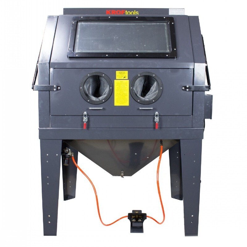 Καμπίνα αμμοβολής με πεντάλ για ποδοκίνηση. Κατασκευασμένη από χάλυβα υψηλής ανθεκτικότητας. Διαθέτει πόρτα στο πάνω μέρος, παράθυρο φωτισμού (990x342x5mm) και παράθυρο επιτήρησης εργασίας (730x360x5mm) με Plexiglass (740x360x1,5mm). Φέρει 3 φώτα εργασίας LED με μήκος 900mm και ισχύ 110-120V/60Hz (220-240V/50Hz) 54W. Κατάλληλο για καθαρισμό εξαρτημάτων με άμμο. Χρησιμοποιεί υαλοσφαιρίδια με κοκκοποίηση μεταξύ 200 και 300.